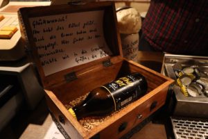 Ein bloßes Verkosten sollte es in dem Fall nicht werden, das konnte man schon dem Einladungsschreiben entnehmen. Der Treffpunkt war nämlich der Munich Escape Room, versteckt im Keller eines Münchner Familienhauses im Süden Schwabings. Die Aufgabe des Escape Rooms: „Finde das Geheimnis des besten Bieres der Welt“. Den Eintritt in die Welt des Oachkatzlbräu machten wir – wie für München üblich – durch eine bis ins Detail nachgebildete Boazn. Einige verzwickte Aufgaben, verlorene Nerven und Einsätze von Taschenlampen später war das Ziel erreicht, und wir hielten den güldenen Preis in den Händen. Zwar trug der noch den Namen Don Limone, aber es ging schon in die richtige Richtung. Glücklich, hungrig und durstig zugleich machten wir uns nun auf zur Brotzeit und Verkostung des Kriminellen Hellen. Übrigens kann im Munich Escape Room „Oachkatzlbräu“ auch bald das Oachkatzlbier erstanden werden, und eventuell schmeckt das sehr limonig.