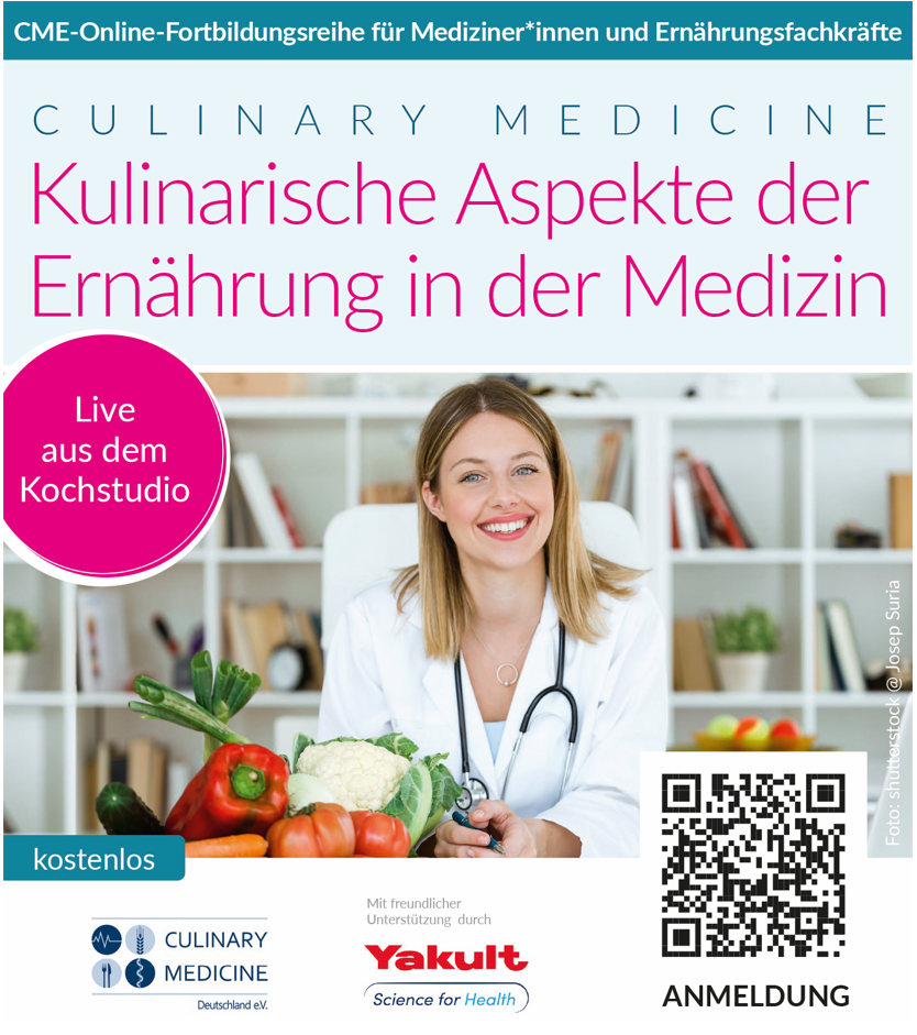 Seit jeher setzt Yakult seine Expertise in der Wissenschaft ein, um dem Hauptanliegen seines Gründers Dr. Minoru Shirota gerecht zu werden: Die Gesundheit aller Menschen auf der Welt zu verbessern. In diesem Sinne ist die Wissenschaftsabteilung des Unternehmens stets auf der Suche nach attraktiven und neuartigen Fortbildungsangeboten, von denen medizinische Fachkräfte in ihrer tägliche Beratungsarbeit profitieren können. Das Konzept der Online-Fortbildungsreihe der Culinary Medicine e.V. basiert auf einem interdisziplinären Ansatz und ist in Kooperation mit dem Institut für Ernährungspsychologie an der Georg-August Universität-Göttingen entstanden: Dazu kombiniert Culinary Medicine Ernährungsmedizin, Ernährungswissenschaften, Diätetik und Psychologie mit praktischer Kulinarik. Durch diese Kombination können ernährungsmedizinische Erkenntnisse in die Lebenswelten von Patientinnen übertragen werden, um den Erfolg des Beratungsprozesses zu optimieren. Ziel der kostenlosen Online-Fortbildungsreihe ist es, Krankheitsbilder zu erkennen, zu unterscheiden und die Indikationen zur Ernährungstherapie zu stellen. Darüber hinaus werden die Prinzipien der Ernährungstherapie und deren praktische Umsetzung in der Diätetik und Kulinarik aufgegriffen. Die Fortbildung richtet sich an Ärztinnen aus den Fachbereichen Ernährungsmedizin, Allgemeinmedizin, Innere Medizin und Gastroenterologie, wie auch an Ernährungsfachkräfte.